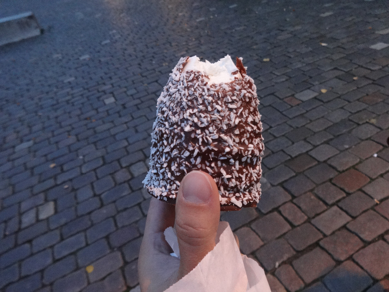 C'était de la crème de la consistance d'un marshmallow enrobé dans du chocolat avec des éclats de noix de coco. C'est bon, mais c'était un peu trop. On l'a mangé tout en nous baladant un peu dans Bergen. Nous sommes allées notamment à la pointe ouest de la ville, et nous avons pu voir les îles alentour de nuit...